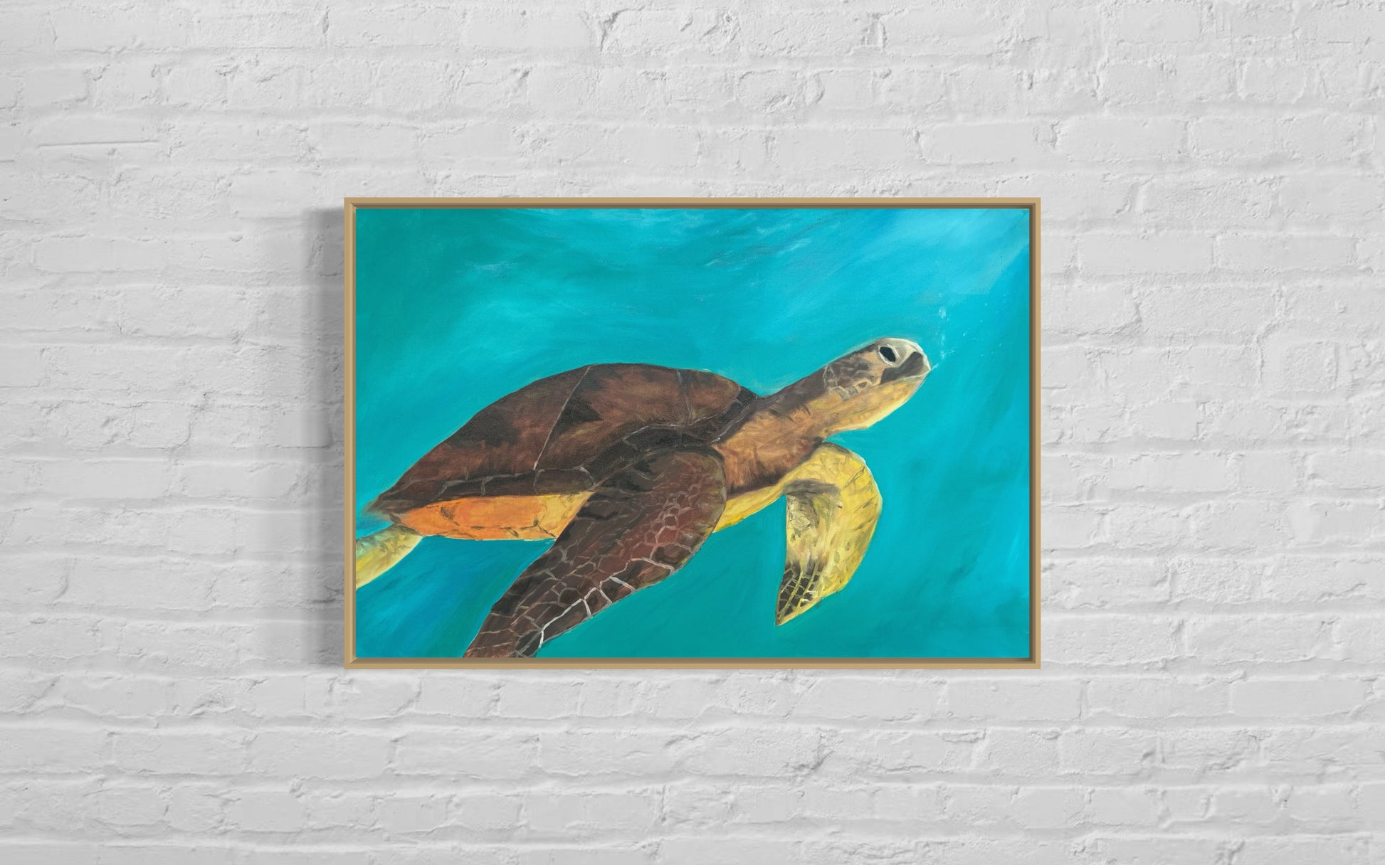 This vibrant painting captures the serene beauty of a sea turtle gliding effortlessly through crystal-clear blue waters. The turtle’s detailed shell, rendered in earthy browns and golds, contrasts beautifully with the tranquil turquoise backdrop, creating a sense of peace and quiet strength. Soft brushstrokes give the ocean depth and movement, while the turtle’s poised expression adds a sense of gentle wisdom. Perfect for ocean lovers and coastal interiors, this artwork brings the calming rhythm of the sea into any space.